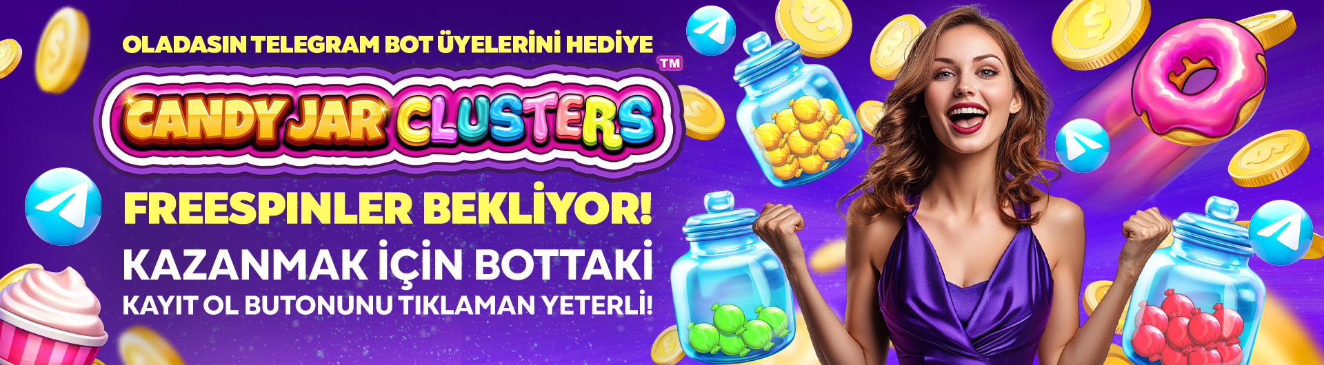 ★ Oladasın Telegram Bot’a kayıt olan tüm üyelerimiz 50 adet Candy Jar Clusters freespin kazanacak olup, spin değeri 2 TL’dir.